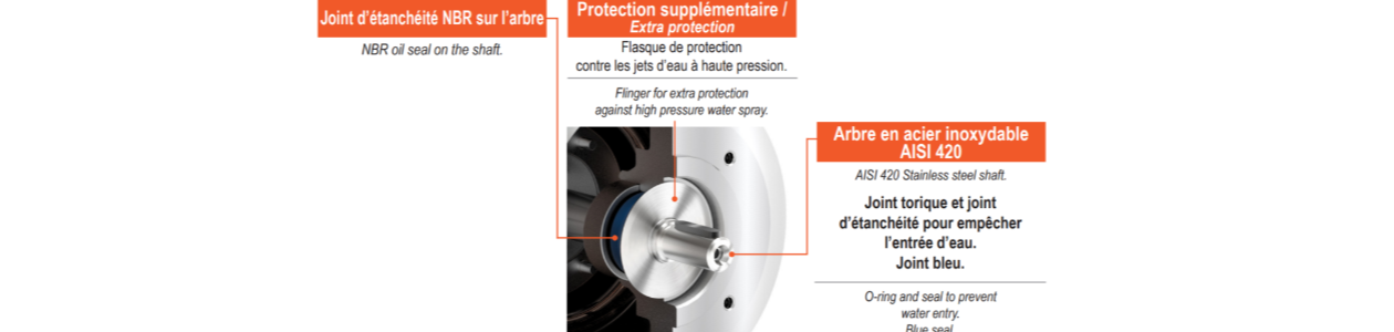 Pour garantir une protection renforcée contre les infiltrations, les motoréducteurs sont équipés de joints Viton doubles, avec une protection en acier inoxydable. Cette configuration assure une étanchéité IP69K, le niveau le plus élevé, parfaitement adapté aux environnements soumis à des lavages fréquents ou à haute pression.